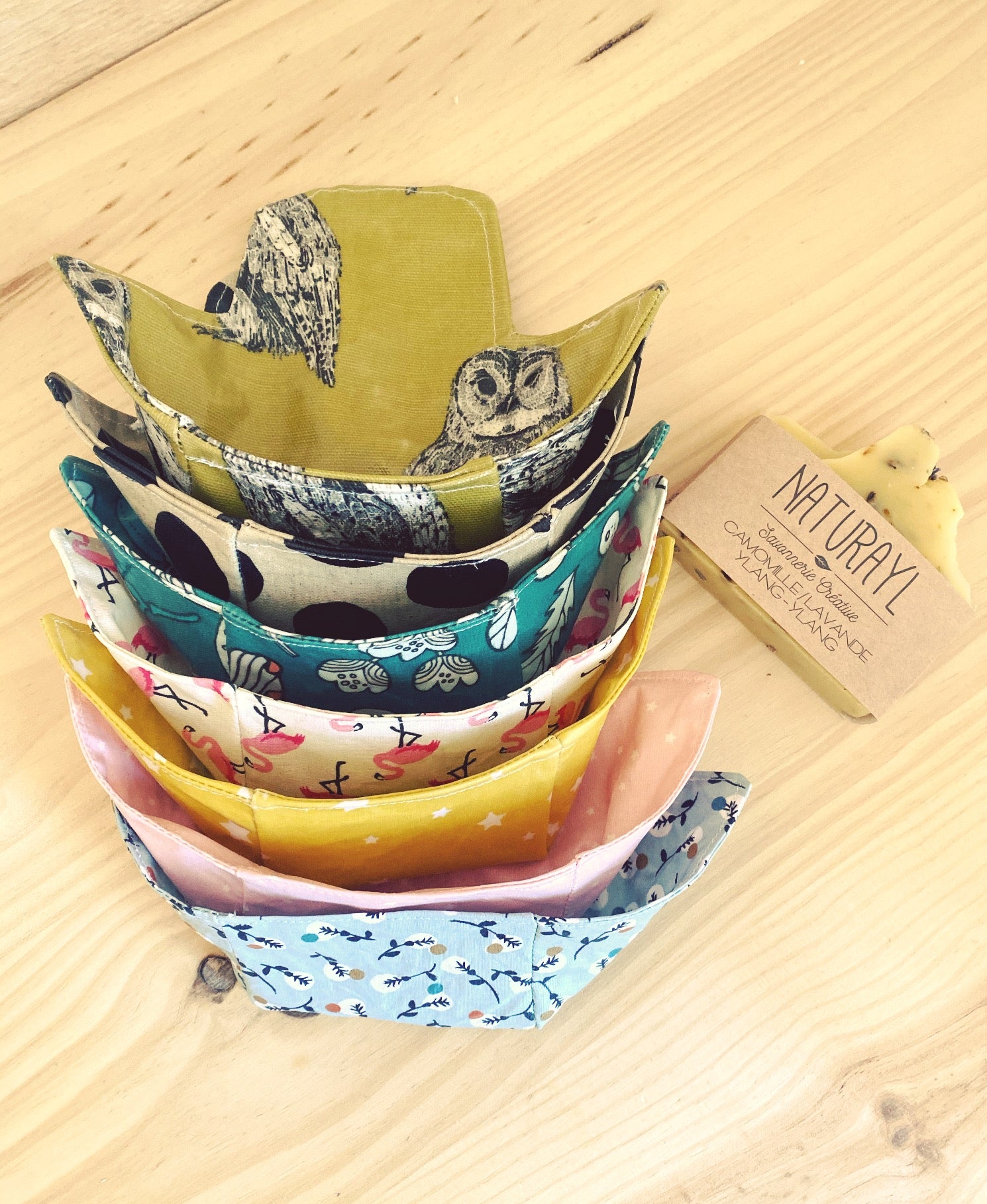 la Pochette à Savon : j'ai cousu ces pochettes à savon car j'utilise des savons solides et souvent que je pars en voyage mes savons sont mouillés au moment où je les ranges.